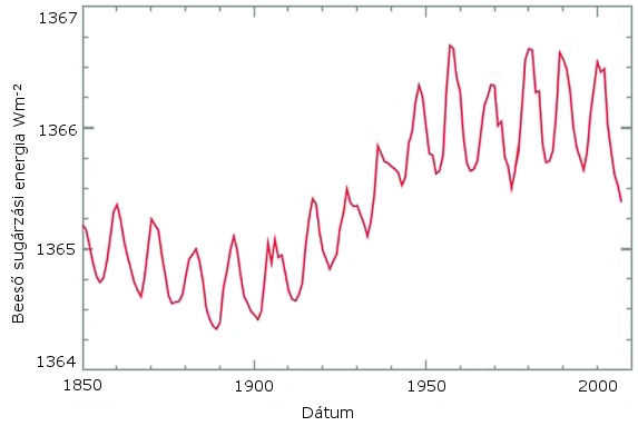 | b. | A napállandó fluktuációjának idősora A néhány tized Wm-2 értékű, a Nap 11 éves ciklusát megjelenítő ingadozások valamelyest emelkedő trendbe (összesen +0,1 Wm-2) csoportosulnak. Ha e hipotézis igaznak bizonyul, akkor ez részben magyarázza századunk első felének pár tized fokos melegedését (amit eddig inkább az üvegházgázoknak tulajdonítottunk), másrészt néhány tized fokos hűtő hatást fejthet ki az elkövetkező évtizedekben. |