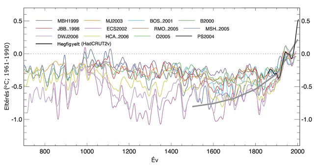 Az alábbiakban mégis ennél régebbre tekintünk vissza, mégpedig az IPCC (2007) Jelentésben összefoglalt közvetett, később műszeres források alapján (1. ábra). Ezekre a nagyon régi korokra még inkább igaz, hogy a térben és időben hiányos megfigyelésekből legfeljebb a változásokat tudjuk rekonstruálni, magukat az eredeti térbeli átlagokat sokkal kevésbé. Ezért csak az 1961-1990-hez viszonyított megváltozásokat (és a sokféle rekonstrukció egymáshoz viszonyított eltéréseit) tudjuk bemutatni. Az egyes rekonstrukciók között bizony egyes időszakokban akkorák az eltérések, mint maga a végbement változás, míg más esetekben a módosulás meglehetősen egyértelmű.