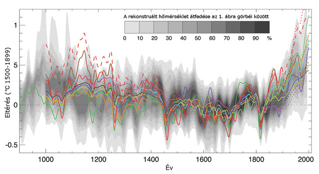 A 2. ábra már nem csak a megfigyelések alapján rekonstruált adatsorokat tartalmazza, hanem a külső éghajlati kényszerek ismert részének hatása alatt a fizikai folyamatokat megjelenítő matematikai modellekben kialakuló északi félgömbi átlaghőmérséklet alakulását is. Megfigyelhető, hogy a 13-14. századtól kezdve a fél-egy évszázados változások már jól egybeesnek a modellek és a rekonstrukciók hibasávjai között. Más szóval a naptevékenység, a vulkánosság (az utóbbi évszázadban) alakulásával a történések földi átlagban jól magyarázhatók. Ez azért is fontos, mert ez valószínűsíti, hogy a 20. században megfigyelt változásokat is ugyanilyen jól rekonstruáljuk, vagyis az utóbbi évtizedek felmelegedésének az okát biztosan nem ezekben a jól ismert, de a modellekben tegyük fel rosszul számított természetes folyamatokban kell keresnünk.