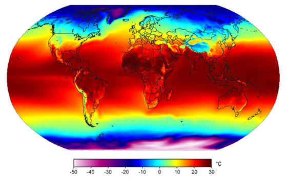 Az évi középhőmérséklet eloszlása a Földön (1961-1990).