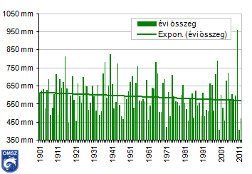 Az országos évi csapadékösszegek 1901 és 2012 között