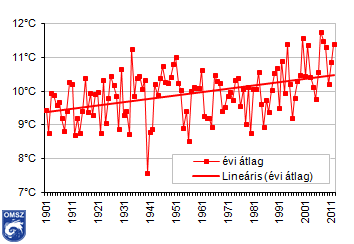 emelkedést mutat, mely az elmúlt 112 évben +1.08°C-nak, az elmúlt 30 évre vonatkozóan pedig +1.35°C-nak adódik.