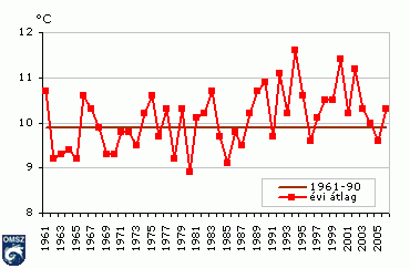 2006-ban az országos évi középhõmérséklet 10,3 °C volt, ami 0,6 °C-kal meghaladta az 1961-90-es 30 éves átlagot (1. ábra).