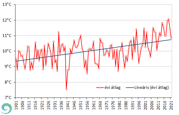 Magyarországon a 2021-es évi középhőmérséklet országos átlagban 10,84 Celsius foknak adódott (1. ábra), 0,1 fokkal volt melegebb az 1991–2020-as éghajlati normálnál. 2021 az ellenőrzött, homogenizált (MASH v3.03) és interpolált (MISH v1.03) adatok alapján a 19. legmelegebb az elmúlt 121 évben. Az évi középhőmérséklet országos átlaga 90%-os megbízhatósági szinten szignifikánsan emelkedik az 1901-től kezdődő hosszú idősor lineáris trendbecslése alapján (1. ábra). Az évi középhőmérséklet országos átlagának változása az elmúlt 121 év alatt (1901 és 2021 között) átlagosan +1,38 Celsius foknak adódott, míg az országon belül legalább +1,25 °C és legfeljebb +1,63 °C közötti hőmérséklet-változás fordult elő.