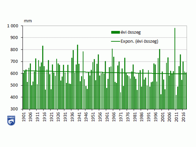 A 2018-as évben összességében átlagos mennyiségű csapadék érkezett, azonban az éven belüli eloszlása nagymértékben eltért a szokásostól. A legtöbb csapadék ugyan júniusban hullott, 35%-kal több, mint az éghajlati normál, de február és március hónapokban a normál több, mint duplája érkezett, főként hó formájában. Ugyanakkor a többi hónapban, különösen áprilisban és októberben alig érkezett csapadék, a sokévi átlag csupán 40%-a. Az éves átlagos csapadékösszeg 2018-ban 607,7 mm, mely az 1981-2010-es sokévi átlag 101 %-a. Az elmúlt 118 év éves csapadékösszegekhez illesztett exponenciális trend alapján mérsékelt csökkenést tapasztalunk (2. ábra), azonban a változás 90%-os megbízhatósági szinten nem szignifikáns! Az éves csapadékösszeg változása 1961 és 2018 között ugyanakkor országos átlagban 4,83 %-os növekedést mutat, azonban a változás ebben az esetben sem szignifikáns, mert a konfidencia intervallum 90%-os megbízhatósági szinten [-20%;+23%], így statisztikai értelemben nem jelenthetjük ki egyértelműen, hogy akár emelkedő, vagy akár csökkenő változást mutat a sor.