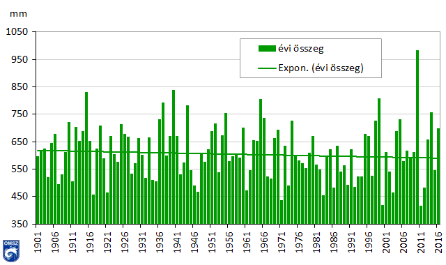 A 2016-os év átlagosnál csapadékosabbnak tekinthető az 1901-től induló adatsorban. Különösen februárban és júliusban érkezett rekord mértékű csapadékmennyiség. Az éves átlagos csapadékösszeg 699 mm, mely a sokéves átlag 117%-a. Az elmúlt 116 év adataihoz exponenciális trendet illesztve 3,6%-os mérsékelt csökkenés jelentkezik, míg az elmúlt 30 évet tekintve 14,6%-os növekedés figyelhető meg az éves csapadékösszegekben (2. ábra).