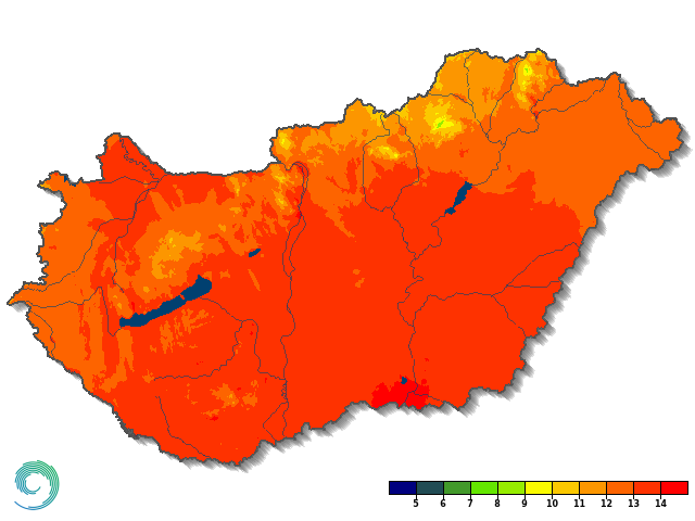 A 2024-es év során az ország déli részén és az alföldi területeken az éves középhőmérséklet 13-14 °C között, az északi és a magasabban fekvő helyeken általában 11-13 °C között, míg a legmagasabb csúcsok közelében 9-10 °C között alakult. Az Alföld déli részén (Szeged környékén) a középhőmérséklet egy foltban meghaladta a 14 °C-ot is (4. ábra). Ebből is látszik a 2024-es év rendkívülisége, mivel 2023-ban még a 13 °C-ot meghaladó terület mérete is kevesebb mint az ország egytizede volt, és nem jelentkezett 14 °C feletti érték.