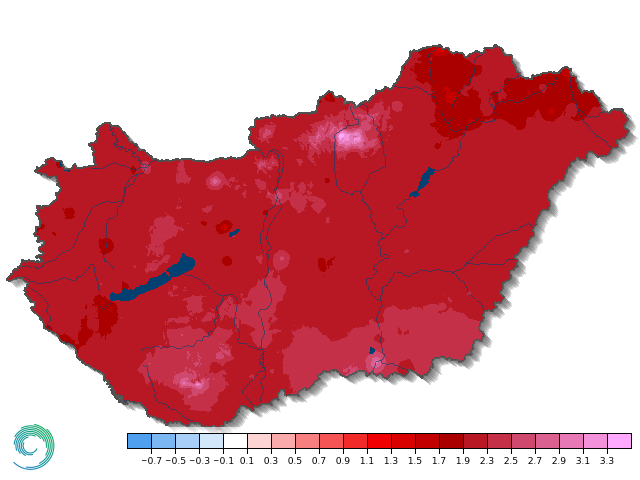 A 5. ábra az évi középhőmérséklet eltérésének területi eloszlását mutatja az 1991-2020-as éghajlati normálhoz viszonyítva. Az országon belül többnyire 1,9-2,3 °C közötti anomáliák adódtak. Az ország déli területein az eltérés mértéke sokfelé 2,3-2,5 °C közé esett, Szeged és Pécs, továbbá a Mátra és a Bükk területén még ennél is nagyobb anomália jelentkezett: 3 °C-os és afeletti értékeket tapasztalhatunk. A legkisebb anomália az ország északkeleti részén volt jellemző (1,7-1,9 °C).