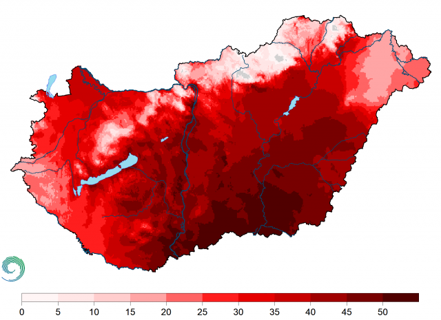 Az év fontos jellemzője az éghajlati indexek számának alakulása, például a hideg és a meleg küszöbnapok száma. Fagyos napból (Tmin ≤ 0 °C) 66 nap volt, ez 24 nappal kevesebb az 1991-2020-as normálnál. Téli napból (Tmax ≤ 0 °C) 2 nap fordult elő a szokásos 24 helyett. A zord napok (Tmin ≤ -10 °C) száma mindössze 1 volt, míg a normál 8 nap. Zabar állomáson volt a legtöbb, itt 8 napot regisztráltunk, ami megegyezik a zord napok országos normál értékével. A nyári napok száma (Tmax ≥ 25 °C) 118 volt, ami 32 nappal, tehát jelentősen meghaladta az 1991-2020-as átlagot (87 nap). A hőhullámos napok (Ta ≥ 25 °C) területi eloszlását mutató 6. ábra szerint 2024 nyarán az Alföld túlnyomó részén 40-nél több ilyen nap fordult elő, a déli területeken pedig meghaladta az 50 napot, míg a Kisalföldön 30-40 nap jelentkezett. A legkevesebb hőhullámos nap a hegyvidékeken volt, a Mátra és a Bükk legmagasabban fekvő részein. 2024-ben hőségnapból (Tmax ≥ 30 °C) a normál (29 nap) kétszerese adódott, összesen 61 napot jegyeztünk. Baja Csillagvizsgáló állomáson volt a legtöbb, összesen 86 hőségnap jelentkezett. A forró napok száma (Tmax ≥ 35 °C) országos átlagban 15 nap volt, ami az 1991-2020-as átlag 5-szöröse.