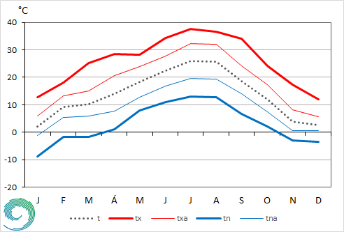 A 7. ábrán látható Budapest Pestszentlőrinc állomáson a különböző hőmérsékleti értékek 2024. évi menete (tx – havi maximum, txa – a napi maximumok havi átlaga, t – átlag, tna – a napi minimumok havi átlaga, tn – havi minimum). Szembeötlő az enyhe február, amikor a havi minimum és a napi minimumok havi átlaga is a márciusi értékekhez hasonlóan alakult, de még az átlaghőmérsékletek között is alig adódott különbség. Kirajzolódik továbbá egy nagyon meleg, hőhullámokban gazdag nyári időszak. Nem csak a nyári hónapok, de még szeptember első dekádja is forrósággal telt, így nem meglepő, hogy a júniusi és szeptemberi maximumhőmérsékletek alig tértek el egymástól. 2024-ben a Budapest Pestszentlőrinci állomáson a hőmérsékleti szélsőértékek közötti abszolút terjedelem meghaladta a 45 °C-ot (július 37,6 °C, január -8,7 °C). Júniusban a napi maximumok 34 °C körül alakultak, míg júliusban és augusztusban 36-38 °C közötti értékek voltak jellemzőek. A napi minimumok januárban -1 °C közelében alakultak, decemberben és novemberben a minimumok átlaga 0-1 °C közötti értéket vett fel, míg februárban meghaladta az 5 °C-ot. A havi hőmérsékleti terjedelem áprilisban (27,7 °C) volt a legnagyobb, a havi minimum alig volt több, mint 1 °C, míg a havi maximum meghaladta a 28 °C-ot. A legkisebb havi hőingás pedig decemberben (11,4 °C) adódott.