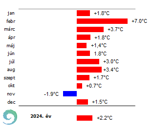 2024-ben november volt az egyetlen olyan hónap, amikor az 1991-2020-as sokévi átlag alatt maradt a havi középhőmérséklet (3. ábra). A többi tizenegyből négy hónap volt, amikor az anomália mértéke elérte vagy meghaladta a 3 °C-ot. A legnagyobb különbség februárban adódott (+7,0 °C), ezt a március (+3,7 °C), augusztus (+3,4 °C) majd július (+3,0 °C) követte. Az augusztus a 2., míg a többi az 1. legmelegebb lett a 124 éves idősorban, a megfelelő hónapok sorában. Az év felében a középhőmérséklet +1 °C és +2 °C közötti értékkel tért el a megszokottól. A 2023/24-es tél, 2024-es tavasz és nyár egyaránt a legmelegebbnek bizonyult 1901 óta.