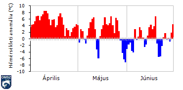 Az áprilisinál változékonyabb volt a hõmérséklet. Az idõszak elsõ felében (7-12.), valamint a hónap közepétõl kezdõdõen az idõszak végéig a napi átlagok a sokévi értékek felett helyezkedtek el. 11-én adódott a legnagyobb pozitív eltérés, +5°C országos átlagban, majd a hónap végén az erõteljes lehûlés után, 30-án a hõmérséklet közel 7 fokkal maradt el szokásostól. Ezen a napon Zabar állomáson 0,8°C-ot mértek az éjszakai órákban, amivel megdõlt a napra jellemzõ minimumhõmérsékleti rekord.