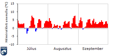 A napi országos középhõmérsékletek alapvetõen az átlag felett helyezkedtek el, csupán néhány napra csillapodott a kánikula. 10-én volt a legnagyobb negatív eltérés országos átlagban (-3°C). A leghidegebbet 27-én mérték, 4,1°C-t, amely az eddig mért legalacsonyabb hõmérséklet ezen a napon, és a mérés helye ismételten Zabar állomásunk volt. A maximális pozitív anomália 23-án adódott (+6°C). Ekkor mértük a hónap és egyben az év legmagasabb hõmérsékletét is, 37,2°C-ot Kiskunhalason.