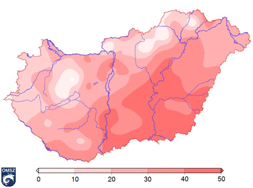 A hõmérsékleti küszöbnapok éves országos átlagai a melegedés irányába mutatnak, meleg küszöbnapokból általában több volt a szokásosnál, míg hidegbõl kevesebb; Fagyos nap (Tmin<=0°C) átlagosan 76 darab volt, ami 21-gyel kevesebb az 1971-2000-es normálnál. A zord napok (Tmin<=-10°C) száma (10 db) nem volt rendkívüli, csupán eggyel volt több a vártnál, és hasonlóan alakultak a téli napok (Tmax<=0°C) is, országos átlagban 26-ot számoltunk a szokásos 25 helyett. A meleg küszöbnapok tekintetében nyári nap (Tmax>=25°C) országos átlagban 101 alkalommal fordult elõ, ami 26-tal több a szokásosnál. Arányaiban hasonlóan markáns volt az eltérés a hõségnapok (Tmax>=30°C) számában is; általában 20 szokott lenni, de tavaly 8-cal többször mértünk 30°C-nál magasabb maximumhõmérsékletet. A hõségnapok területi eloszlását tekintve (9. ábra) elmondható, hogy az Alföldön számláltuk a legtöbbet, helyenként ez a szám az 50-et is elérte, míg középhegységeinkben volt, hogy elõ sem fordult a hõmérsékleti kritériumnak megfelelõ nap. Forró nap (Tmax>=35°C) mindössze egyszer volt, ami összhangban van a sokéves átlaggal.