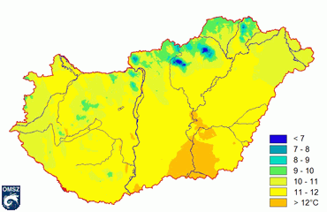 Az éves középhõmérsékletek területi eloszlását tekintve (8.ábra) a kép nem tér el jelentõsen a várttól: középhegységeink kirajzolódnak, és valamelyest az észak-déli növekvõ tendencia is megfigyelhetõ. Általában 6-10°C között helyezkednek el az értékek, 2009-ben ennél melegebb volt, 5,8 és 13,1°C között változott a hõmérséklet az ország területén. A leghûvösebb a Mátrában és a Bükkben volt, túlnyomó többségben itt fordultak elõ 7°C alatti értékek, míg 12°C-nál magasabb hõmérsékletû terület elsõsorban az Alföldön a Tisza mentén rajzolódott ki.