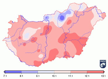 2007-ben az országos évi középhõmérséklet 11,7 °C volt, ami 1,7°C-kal meghaladta az 1971-2000-es 30 éves átlagot. Az országon belül 7,1°C és 13,3°C között alakultak az évi középhõmérséklet értékek (8. ábra).