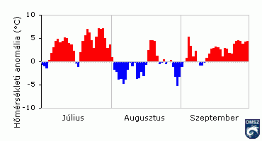 Napi országos középhőmérsékletek eltérése az (1961-90-es) átlagtól 2006. július, augusztus, szeptember
