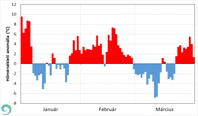 A megszokottnál hűvösebb idővel kezdődött a március. Egy magassági hidegörvény hatására lassan hűlt az idő. 8-9-én egy anticiklon peremén átmenetileg egy összeáramlási vonal hatására mérséklődött az éjszakai lehűlés, így kis mértékben emelkedtek a napi középhőmérsékletek. Ezt követően a Kelet-Európai-síkság felett uralkodó anticiklon peremére került térségünk, melynek hatására északkeleti áramlással szárazabb, hidegebb levegő érkezett és okozott lehűlést. Március 11-én már több mint 6 °C-kal volt hidegebb a sokévi átlagnál. A hideg levegő beáramlásának megszűnésével fokozatosan erősödött a nappali felmelegedés, és a fagyos éjszakák dacára is növekedtek a napi középhőmérsékletek. Március 15-én éjszaka északnyugat felől egy kisebb ciklon érte el Magyarországot, ami lehűlést okozott, majd 18-tól anticiklon hatása alá került térségünk, ezért napos, száraz idő volt, eleinte kemény éjszakai fagyokkal. Fokozatosan emelkedtek a napi középhőmérsékletek, március 22-től egészen a hónap végéig a szokásosnál melegebb idő uralkodott. A hónap végére leépült az anticiklon, az átalakult nyomási viszonyok kedveztek a hőmérséklet emelkedésének, így a hónap legmelegebb napja 29-e lett (4. ábra).