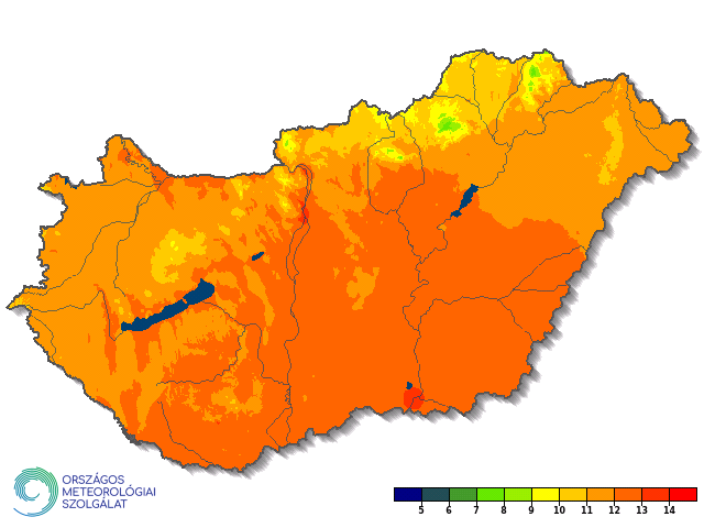 A 2022-es év során az évi középhőmérséklet területi eloszlása leginkább a domborzat hatását tükrözte. Az ország legnagyobb részén 11-13 °C közötti átlaghőmérsékletek voltak jellemzők (8. ábra). Szeged és Budapest térségében az éves középhőmérséklet meghaladta a 13 °C -ot. A Dunántúli-középhegység magasabban fekvő részein többnyire 10-11 °C, míg az Északiközéphegységben jobbára 9-11 °C volt jellemző. A Mátra, a Bükk, a Zempléni-hegység és a Börzsöny legmagasabban fekvő régióiban az évi átlag 8 °C alatt maradt.