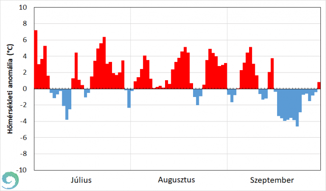 A szeptember középhőmérséklete országos átlagban 15,6 °C, ami 0,5 °C-kal marad el a sokéves átlagtól. Az átlagnál hűvösebben indult a hónap egy peremhullám miatt, majd ezt követően egy anticiklon hatására az átlagnál melegebb napok következtek. Szeptember 8-tól 13-ig fokozatosan csökkentek a normál érték alá az országos napi középhőmérsékletek. 13-án dél 9 felől melegebb levegő áramlott térségünkbe, melynek következtében a hónap közepén átmenetileg az átlag fölötti hőmérsékleteket kaptunk. A nyárias időnek egy szeptember 15-én éjszaka érkezett hidegfront vetett véget, ami jelentős lehűléssel járt. Az ezt követő frontok, majd egy anticiklon stabilizálták ezt a helyzetet, így szeptember második felét átlag alatti hőmérsékleti értékek jellemezték. A hónap utolsó hetében a csapadék érkezésével párhuzamosan az idő is enyhülni kezdett, így szeptember utolsó napján már a normál fölé melegedett (6. ábra).
