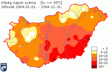 A hőmérsékleti küszöbnapok száma is a sokévi átlagnak megfelelõen alakult. 2004-ben országos átlagban 28 nap volt téli (Tmax <= 0°C) és 8 nap zord (Tmin <= -10°C), nulla fok alatti hõmérséklet pedig 95 napon fordult elõ, ami mind átlagközeli érték. 2004-ben nyári nap (Tmax >= 25°C) 66 volt átlagosan, ami a szokásosnál csupán 3 nappal kevesebb. A hõségnapok száma (Tmax >= 30°C) 14 volt, ami szintén mindössze 2 nappal marad el az átlagos 16-tól. Tavaly átlag 1 forró napunk (Tmax >= 35°C) volt, ami megfelel az 1961-1990-es idõszak átlagának.