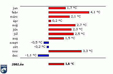 A 2002. év hőmérsékleti viszonyainak jellemzésére megnéztük a hőmérsékleti küszöbnapok elõfordulásait is. Az év során átlagosan 24 téli napot (Tmax <= 0°C) regisztráltak, ez a sokéves átlag alatt maradt. Az elmúlt évben átlagosan 95 napon süllyedt a hőmérő higanyszála fagypont alá az ország területén, ami közelítõleg megegyezik a sokéves országos átlaggal. Nyári nap (Tmax >= 25°C) átlagosan 79 fordult elõ, ami több a szokásosnál. Hőségnapot (Tmax >= 30°C) átlagosan 25-öt regisztráltak, ebből 15 szokott elõfordulni évente. Tavaly átlag 2 forró napunk (Tmax >= 35°C) volt, ezek évi száma az 1961-90-es idõszak alatt nem érte el az 1 napot.