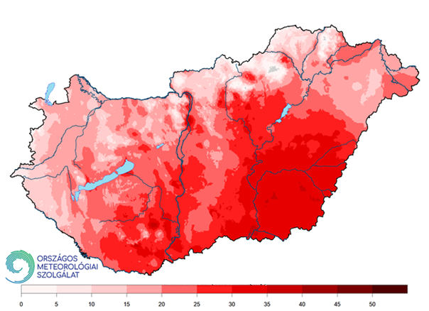 Június első napjaiban még a sokévi átlag alatt maradtak a napi középhőmérsékletek. Ezt követően hosszú ideig a normál felett alakult a hőmérséklet. 13-15-e közt ismét hűvösebb volt időjárásunk, főképp a hajnali órákban, majd a hónap hátralevő részében végig pozitív anomália volt jellemző. Annyira megemelkedett a napi középhőmérséklet, hogy a hónap második felében egymást érték a hőségriasztások. A Kárpát-medence térsége tartósan a Nyugat-Európa fölött örvénylő ciklonok ún. előoldali áramlási rendszerében helyezkedett el. Ezzel az áramlással déli, délnyugati irányból több alkalommal igen meleg, afrikai eredetű légtömeg érkezett térségünk fölé. Június 23-án és 24-én is új országos napi rekord született. Előbbi napon Berettyóújfalu és Dombegyház állomáson is 37,8 °C-ig emelkedett a hőmérséklet, míg 24-én 40,0 °C-kal tetőzött a hőség Fülöpházán.