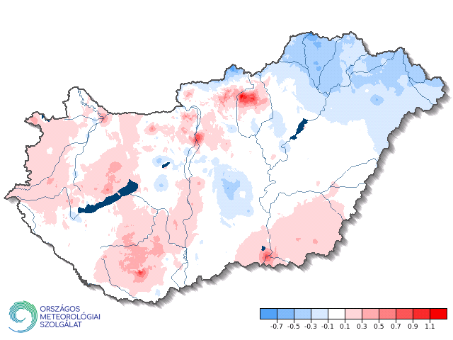 A 9. ábra az évi középhőmérséklet eltérésének területi eloszlását mutatja az 1991-2020-as éghajlati normálhoz viszonyítva. Az ország mintegy harmadán 0 °C körüli érték adódott. Hidegebb volt Északkelet-Magyarországon, itt 0,1-0,5 °C-kal maradtak el a hőmérsékletek a szokásostól. Pozitív anomáliát a Dunántúlon többfelé, a Mátra térségében, az Alföld déli részén és a főváros környéként kaptunk. A nagy városok (Győr, Pécs, Szeged, Budapest) térségében és a Mátra esetén jelentkeztek a legnagyobb értékek 0,7-0,9°C között.