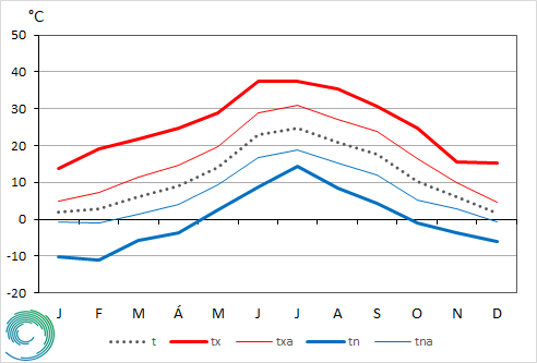 A 11. ábrán látható Budapest Pestszentlőrinc állomáson a különböző hőmérsékleti értékek 2021. évi menete (tx – havi maximum, txa – a napi maximumok havi átlaga, t – átlag, tna – a napi minimumok havi átlaga, tn – havi minimum). Jól azonosíthatók a fagyos téli és tavaszi hónapok, a hűvös május, illetve a meleg június, július és a hűvös augusztus. 2021 folyamán a Budapest Pestszentlőrinci állomáson a hőmérsékleti szélsőértékek közötti abszolút terjedelem megközelítette az 50 °C-ot. Júniusban és júliusban a napi maximumok 30 °C körül alakultak, míg a téli hónapokban a napi minimumok 0 °C alatt voltak. A havi hőmérsékleti terjedelem februárban (30,4 °C) volt a legnagyobb, az igen alacsony napi minimumok és a jóval 20°C körüli maximumok miatt. A legkisebb havi hőingás ezen az állomáson novemberben (19,5 °C) adódott.