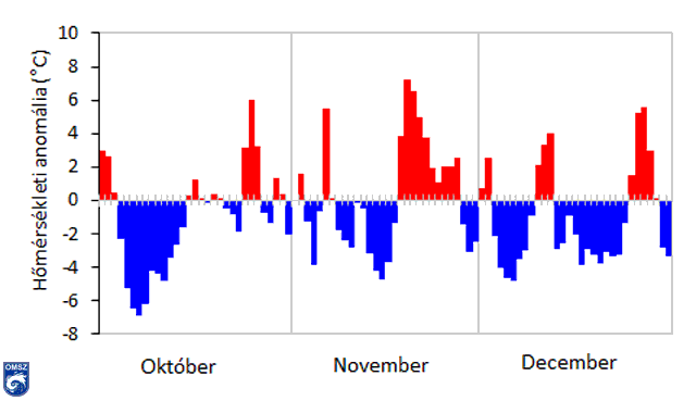 Az ősz utolsó hónapja a sokévi átlagnak megfelelően alakult. Az országos középhőmérséklet homogenizált adatok szerint 4,8 °C-nak adódott. Országos átlagban 0,1°C-kal volt melegebb az 1981-2010-es normálnál. Az ország délnyugati területein az anomália értéke 1-1,5°C között, míg a Tiszántúlon és az északi területeken jobbára -0,5 – -1°C alakult. A hónap elején ciklonok és anticiklonok váltották egymást, ennek következtében a napi hőmérséklet hol a sokévi átlag alatt, hol a felett alakult (7. ábra). A hónap közepén egy kiterjedt anticiklonnak köszönhetően erőteljes lehűlés következett, majd újra gyors felmelegedés vette kezdetét. Ekkor országos átlagban mintegy 7°C-kal volt magasabb a hőmérséklet a sokévi átlagnál. A hónap végén az 1981-2010-es normálnál alacsonyabb értékek jelentkeztek.
