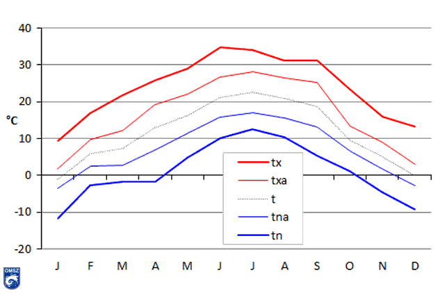 A 11. ábrán látható Budapest Pestszentlőrinc állomásunk hőmérsékletének 2016. évi menete (tx – havi maximum, txa – a napi maximumok havi átlaga, t – átlag, tna – a napi minimumok havi átlaga, tn – havi minimum).