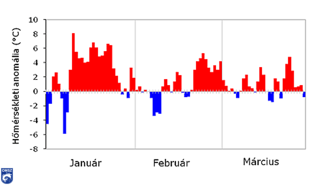 A februári középhőmérséklet +1 és 2 °C között alakult hazánk legnagyobb részén. A Balaton feletti területeken még megjelentek a sokéves átlagtól elmaradó középhőmérsékletek (legfeljebb -0.5 °C), a keleti országrészben azonban már jellemzően a + 1.5°C-ot is meghaladta az anomália értéke. A legnagyobb eltérést Sárospatak és Tokaj között tapasztaltuk. Ezen a területen +3 °C-kal is melegebb volt a megszokottnál. Az országos februári átlaghőmérséklet 1.9 °C-nak adódott, amely 1.3°C-kal haladta meg a normálértéket.