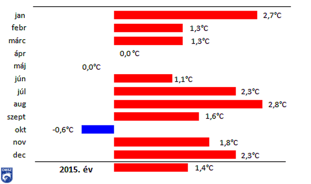 Ahogy 3. ábránkon is jól látható, egy kivétellel az összes hónap jelentősen melegebb volt a megszokottnál. A legnagyobb pozitív anomália augusztusban jelentkezett, a havi átlag 2.8 °C-kal magasabbnak adódott a normálnál. Ezt követi a január (+2.7 °C), illetve a július (+2.3 °C), és a december (+2.3 °C). Mindezek eredményeként az augusztus a 3., a július a 2. és a január pedig a 7. legmelegebb augusztus, július és január, de az első 20 helyezett között szerepel még szeptember és június hónap is. Az április és a május havi középhőmérsékleti értékek megegyeznek a sokévi átlaggal. Ezzel együtt 2015-höz köthető a 6. legmelegebb tél és a 4. legmelegebb nyár az adatsorok 1901-es kezdete óta.