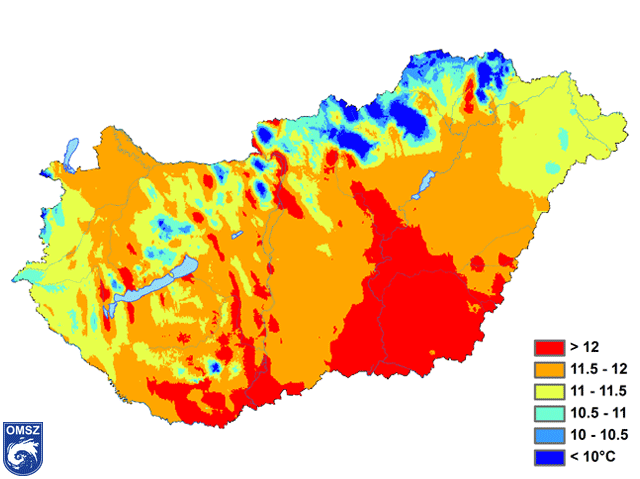 12 °C-nál is magasabb éves középhőmérsékletek jellemezték az ország jelentős részét. DK-ÉNy irányú csökkenés figyelhető meg az értékekben (8. ábra), és mindössze a magasabban fekvő területeinken jegyeztünk 10 °C-nál alacsonyabb átlagokat.