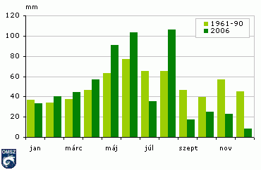 Havi csapadékösszegek 2006-ban és az 1961-90-es átlagértékek (mm)