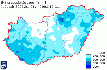 Az elmúlt évben országos átlagban 470 mm csapadék hullott, ami az elõzõ évhez képest 100 mm-rel kevesebb. Csupán január, július és október hónapban hullott az átlagot meghaladó mennyiségû csapadék. Területi eloszlását (7. ábra) tekintve Békés és Komárom-Esztergom megye volt a legszárazabb, itt hullott a legkevesebb csapadék 2003-ban. Tát (Komárom-Esztergom megye) településen összesen csak 270 mm esett az év során. A maximális csapadék-összeg 710 mm volt, amit Kékestetõn mértek.