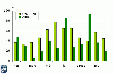 Havi csapadékösszegek 2003-ban és az 1961-1990-es átlagértékek (mm)