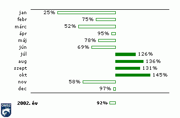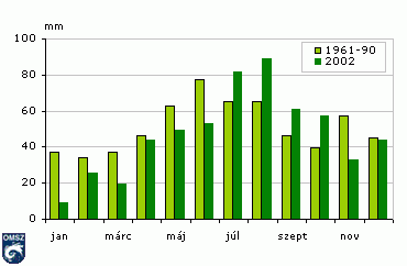 Havi csapadékösszegek 2002-ben és az 1961-1990-es átlagértékek (mm)