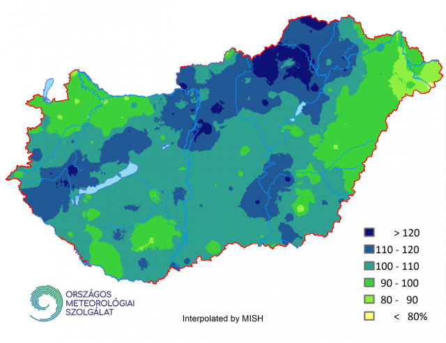 Az 1981-2010-es normált és a 2019. évi csapadékösszeget összevetve elmondható (14. ábra), hogy az ország jelentős részén a megszokott mennyiséghez nagyon közeli (90-110%) értékeket jegyeztük. A normálnál jóval több csapadék érkezett Heves és Borsod-Abaúj-Zemplén megye területére. Ezeken a tájakon helyenként az 1981-2010-es csapadékmennyiség több, mint 120%-a érkezett. A sokévi átlagnál jóval kevesebb csapadék (a normál 80-90%-a) főként a Felső-Tisza vidéken hullott (14. ábra).