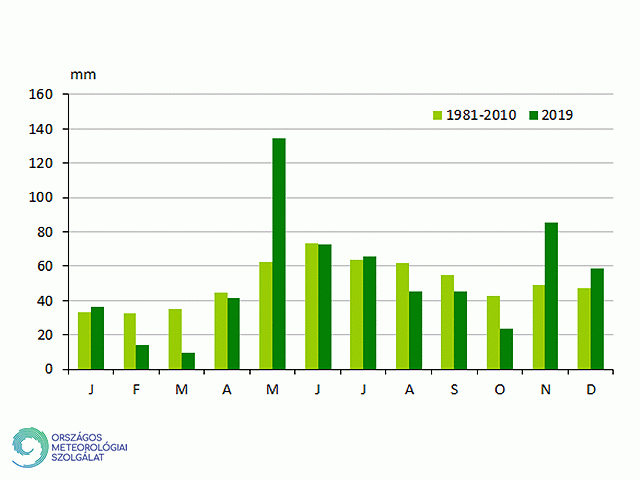 A csapadék éven belüli alakulását a 15. ábrán mutatjuk be. Hazánkban a sokévi átlagok alapján a legszárazabb hónapok általában a január és a február. A nyár elején, júniusban szokott a legtöbb csapadék hullani (elsődleges csapadékmaximum), majd az októberi kicsit szárazabb időszak után novemberben egy második csapadékmaximum azonosítható, bár mértéke sokéves átlagban általában csökken. 2019-ben a tél vége és a tavasz első hónapja kiemelkedően száraz volt, míg májusban a sokévi csapadékmennyiség többszöröse hullott. A várakozásainktól eltérően a legtöbb csapadék tehát nem júniusban, hanem májusban érkezett 2019-ben, mely az aszályos időszak után aranyat ért. A nyári hónapok havi csapadékösszege ugyan elérte a sokévi átlagot, azonban időben nagyon szélsőséges eloszlásban érkezett. A rövid ideig tartó felhőszakadások több településen is károkat okoztak. Augusztustól októberig már mindegyik hónap szárazabb volt, mint az 1981-2010-es időszakban. Végül novemberre és decemberre érkezett újra több csapadék, amely az őszi hónapok hiányát kompenzálta. Az őszre várt másodlagos csapadékmaximum tehát 2019 novemberében megérkezett, és így lehetett átlagosan csapadékos az év.