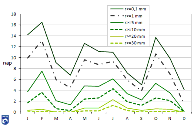 2016-ban 4 nappal többet jegyeztünk a megszokottnál (normál: 86 nap; 2016: 90 nap) azokból a napokból, amikor a csapadék mennyisége meghaladta az 1 mm-t. A szokásos éves menet (17. ábra) szerint májusban és júniusban kellett volna a legtöbb 1 mm csapadék feletti napot detektálnunk, de 2016-ban február, október és január megelőzte ezeket a hónapokat. A 20 mm-t elérő napokból is kettővel több (normál: 5 nap; 2016: 7 nap), míg a 10 mm-t elérő napokból néggyel több adódott (normál: 19 nap, 2016: 23 nap). Havas napból jelentősen kevesebb fordult elő a vártnál: 24 helyett mindössze 13 nap.