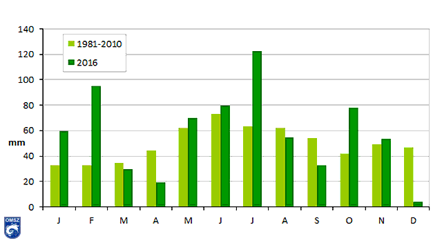 A sokévi átlaghoz közeli csapadékmennyiséget jegyeztünk márciusban (85%), májusban (113%), júniusban (110%), augusztusban (89%), és novemberben (109%). Az átlagosnál jelentősen szárazabbnak bizonyult április (44%) és szeptember (60%). A legszárazabbnak 2016 decembere adódott, amikor a sokévi csapadékmennyiség alig 10%-a hullott. Az országos 3,76 mm havi csapadékösszeggel a 2. legszárazabb december múlt el 1901 óta.
