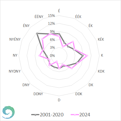 A 20. ábrán a szélirány gyakorisági eloszlását láthatjuk Budapest Pestszentlőrincen a 2001-2020. közötti időszak átlaga és a 2024. év adatai alapján. A sokévi átlag jól mutatja, hogy Budapest esetén az uralkodó szélirány egyértelműen az északnyugati, de a keleti is nagy gyakorisággal fordult elő. 2024-ben az északnyugati irány helyett a keleti szél jelentkezett a legnagyobb arányban, és csak ezt követte az észak-nyugati és az észak-északnyugati irány. Érdekes módon a nyugati és északkeleti szelek a sokéves átlagnál nagyobb arányban képviselték magukat 2024-ben.