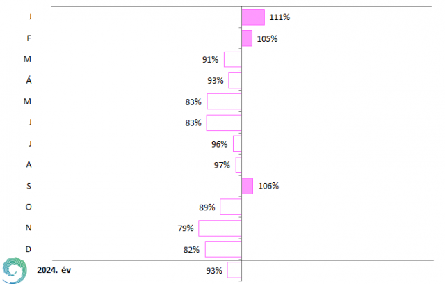 A szélsebesség havi átlagai Budapest-Pestszentlőrincen 2024-ben az 1991-2020-as normál százalékában