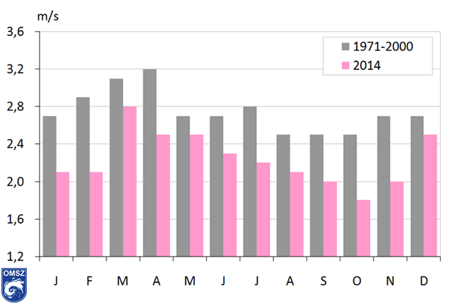 maximum, míg a legalacsonyabb értékeit augusztus és október között veszi fel. 2014-ben a normáltól eltérően a havi átlagos szélsebesség Budapest-Pestszentlőrinc állomáson márciusban volt a legnagyobb, melyet az áprilisi, májusi