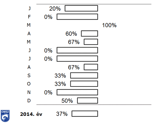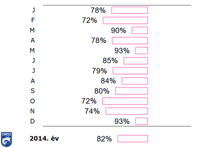 és decemberi átlagok követnek másodikként. Általánosságban elmondható, hogy egyetlen hónapban sem haladta meg a 2014-es átlagérték a normált. A leginkább a januári, februári, októberi és novemberi értékek maradnak el a