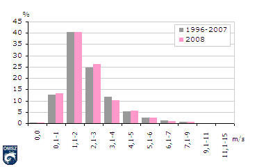 2008-ban Budapest-Pestszentlõrinc állomáson a 0,1-1, 2,1-3 és 4.1-5 m/s-os szélsebességek az átlagnál többször, 3,1-4,0 m/s-os, értékek átlag alatti számban, a többi szélsebesség pedig átlag körüli mértékben fordult elõ. 2008-ban egy hónap kivételével átlag alatt maradt a szeles (>=10m/s) napok száma, míg a viharos (>=15 m/s) napok száma két hónapban volt magasabb a sokévi átlagnál (19 - 21. ábra).
