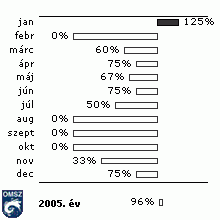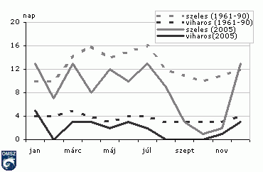 2005-ben (19. ábra) az 1,1-2,0 m/s-os (leggyakoribb) sebességek az ötévi átlagnál többször, a 2,1-3,0 m/s-os értékek átlag körüli mértékben, a többi szélsebesség átlag alatti számban fordultak elõ. Kevesebbszer mértek tehát 2005-ben 1 m/s-nál gyengébb szelet, de a szeles- (>=10m/s) és a viharos (>=15 m/s) napok száma is többnyire átlag alatt maradt (20. és 21. ábra).