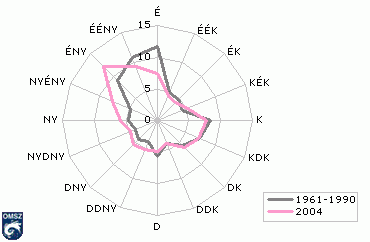 A 17. ábra alapján elmondhatjuk, hogy a szokásosnál sokkal kevésbé volt szeles a 2004. év idõjárása Budapest-Pestszentlõricen, és az évi menet sem a sokévi átlagnak megfelelõen alakult. A tavaszi maximum februárra tolódott, de értéke így is elmaradt a sokévi átlagtól, a nyári másodmaximum májusban következett be. Az õsz végén általában tapasztalható nagyobb szélsebességek 2004-ben fokozottan jelentkeztek, novemberben - az év egyetlen átlagosnál szelesebb hónapjában - az átlagos szélsebesség a februári elsõdleges maximummal azonos értéket vett fel, 3,1 m/s volt.