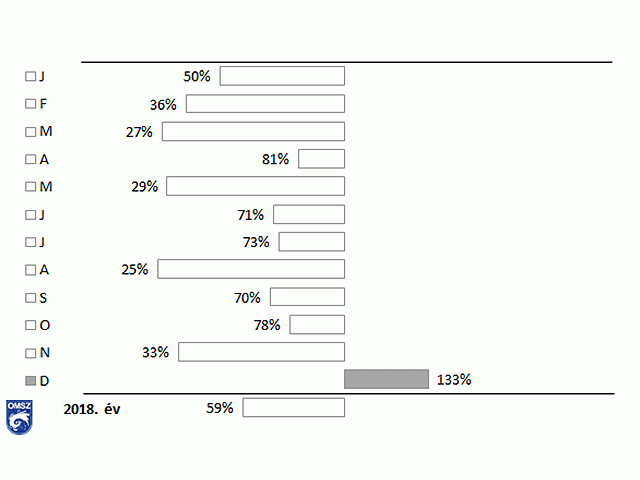 A 19. ábrán jól látható, hogy 2018 októberéig a szélsebesség havi átlagértékei többé-kevésbé elmaradnak az 1981-2010-es sokévi átlagtól. Különösen február és március volt a legkevésbé szeles Budapesten. Áprilistól októberig a legtöbb hónap légmozgása a sokévi áltagnak megfelelően alakult. A legnagyobb pozitív eltérés októberben és decemberben mutatkozott meg: októberben 5 %-kal, decemberben 9 %-kal volt nagyobb a szélsebesség a szokásosnál. Összességében elmondható, hogy Budapest Pestszentlőrinc állomáson az átlagos évi szélsebesség 2018. évben a sokévi átlagtól kissé elmaradt (93%).